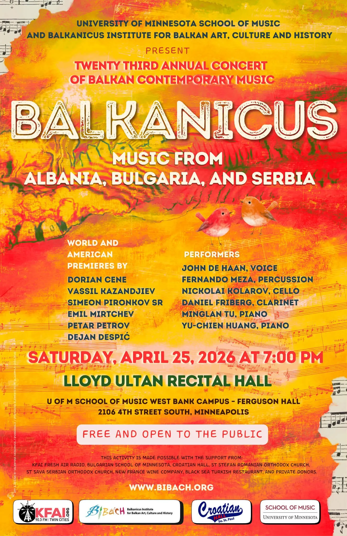 Free and open to the public, doors open at 6:30 PM and the program begins at 7:00 PM on Saturday, April 25th at Lloyd Ultan Recital Hall (Ferguson Hall, University of Minnesota School of Music, West Bank Campus)